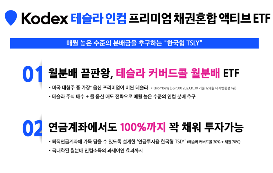 KODEX 테슬라커버드콜채권혼합액티브는 테슬라 주식을 기초 자산으로 하여 콜 옵션을 매도하는 커버드 콜 전략을 사용하고, 국내 우량 채권에 투자하여 안정적인 수익을 추구하는 ETF입니다. 이 제품은 미국 대형주 중 옵션 프리미엄이 가장 높은 테슬라의 성과를 활용하여 매월 분배금을 지급하는 구조로 설계되었습니다.