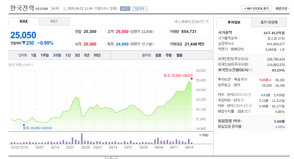 현재 한국전력의 주가는 약 25,050원으로, 최근 몇 달간의 주가 흐름을 살펴보면 상당한 변동성을 보였어요.